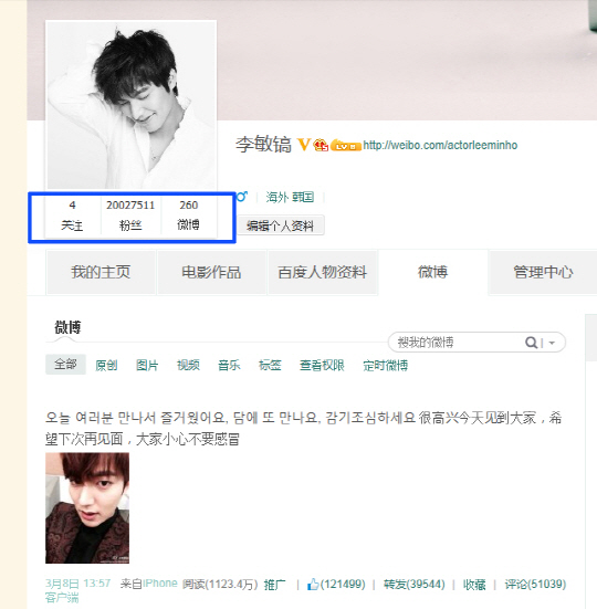 웨이보 회원 수는 지난 해 11월 24일 1000만 명을 돌파한 이후 불과 100일 남짓한 기간에 2000만 명을 넘어섰다. 근래에는 하루 평균 30만명씩, 그야말로 파죽지세로 이민호의 '새로운 친구'가 늘고 있다.