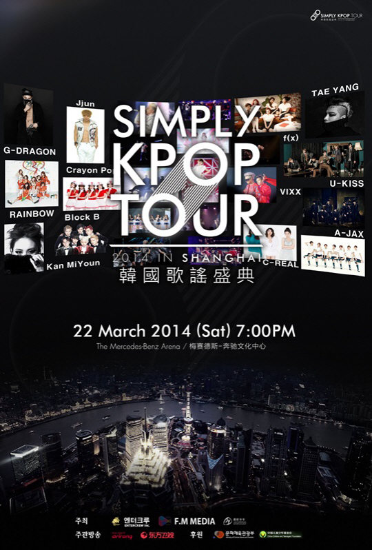 오는 22일 중국 상하이의 대형 공연장인 벤츠아레나(1만8000석)에서는 지드래곤, 태양, 에프엑스, 크레용팝, 유키스, 레인보우, 블락비, 빅스, 에이젝스, 제이준, 씨리얼, 간미연 등 K-POP을 대표하는 총 12팀이 참가한 가운데 '심플리 K-POP 투어 2014 인 상하이(Simply K POP Tour 2014 in Shanghai)가 열린다.