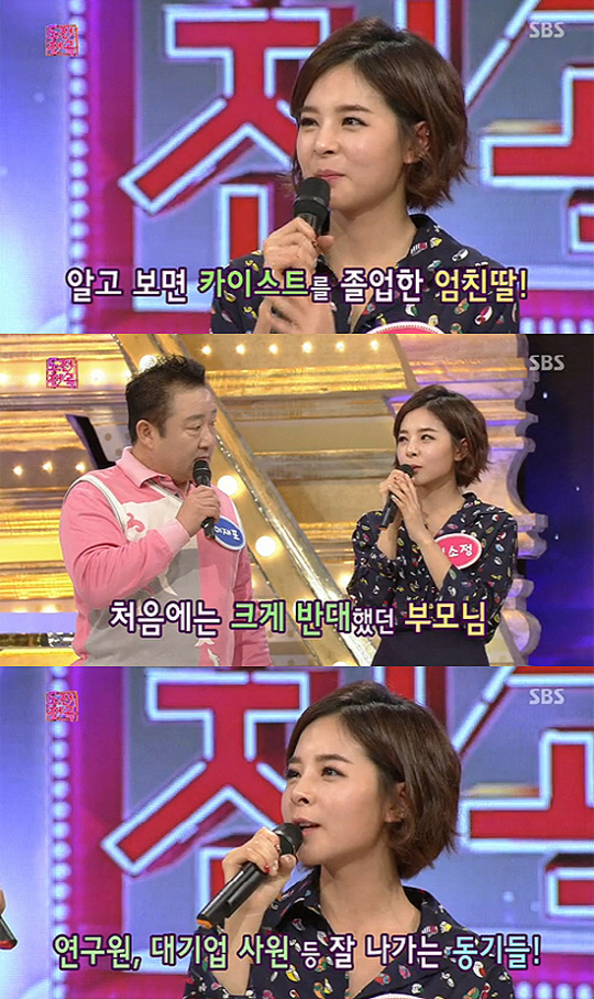 이날 MC 이휘재는 "김소정이 카이스트를 졸업한 수재 출신이다. 가수 한다고 할 때 부모님이 서운해하거나 반대하지 않았냐"고 질문했다.