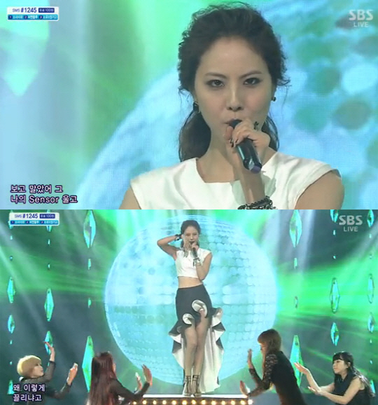 박지윤은 9일 방송된 SBS '인기가요'에서 '빕(Beep)'을 열창하며 화려한 무대를 꾸몄다.