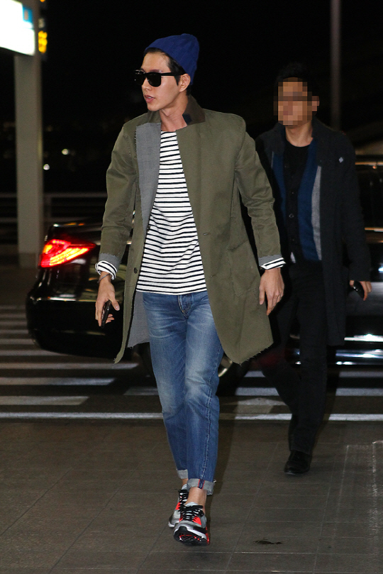 이날 공항에 모습을 드러낸 박해진은 스트라이프 셔츠에 롤업 청바지를 매치, 카키색 트렌치 코트를 멋스럽게 소화하며 우월한 공항패션을 선보였다.