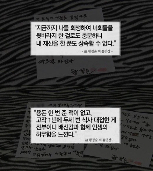 유서에는 "지금까지 나를 희생해 너희들을 뒷바라지 한 걸로도 충분하니 내 재산을 한 푼도 상속할 수 없다"고 적혀 있다. 또한 "용돈 한 번 준적도 없고, 고작 1년에 두세 번 식사 대접한 게 전부이니 배신감과 함께 인생의 허무함을 느낀다"고 전처 아들에 대한 서운함 마음을 드러냈다.