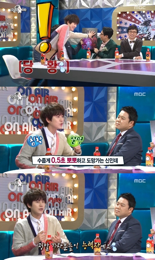 이에 당황한 규현은 사진을 가리려 애를 썼고, MC 김국진은 "규현이 너무 적극적이다"며 놀려댔다.