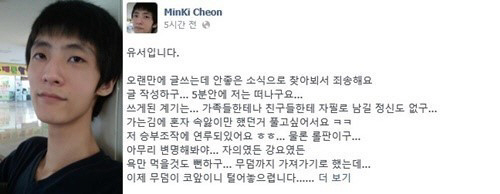 천민기는 12일 오후 LOL 커뮤니티 사이트인 인벤에 "ahq Korea 승부조작 자백합니다"라는 제목으로 긴 글을 게재했다. 또한 자신의 페이스북에 "유서입니다"라는 글도 올렸다.