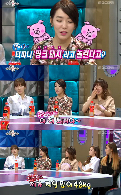 이날 MC들은 "티파니가 멤버들 사이에서 '핑크돼지'로 불린다더라"며 운을 뗐다. 그러자 티파니는 "핑크색을 굉장히 좋아한다"고 설명했다.