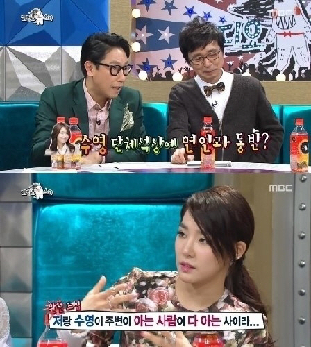 이날 티파니는 "수영이 사석에 정경호를 데리고 온 적이 있냐"는 MC들의 질문에 "있다. 수영이의 주변 사람들은 다 알고 있었다"며 "나와 수영이 주변이 다 아는 사이다. 원래 친했으니 다른 사람들도 있던 자리였다"고 조심스럽게 답했다.