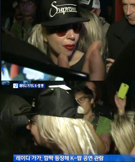 이날 레이디가가는 선글라스와 검정색 모자를 착용하고 경호원들의 보호 하에 박재범 등 한국 가수들의 공연을 관람한 것으로 알려졌다.