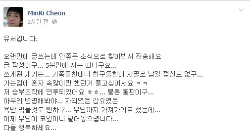 이후 천민기는 자신의 페이스북에 자살을 암시하는 글을 남기고 부산의 한 건물 12층에서 투신을 시도, 경찰에 발견돼 부산 백병원 응급실로 후송돼 팬들에게 큰 충격을 주고 있다.