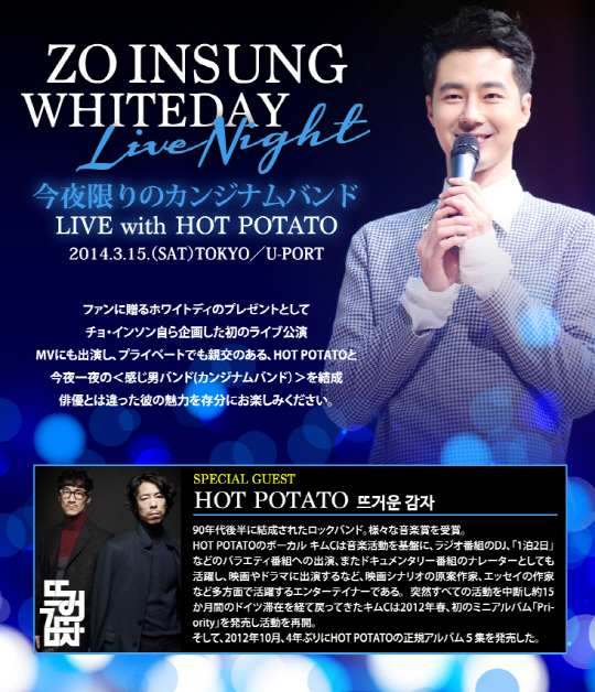 배우 조인성이 일본 단독 팬미팅 '2014 Zo In Sung White Day Live Night with 뜨거운 감자'를 개최한다.