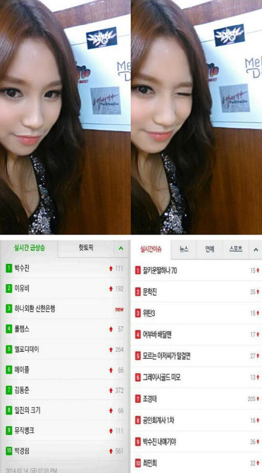 14일 박수진은 자신의 트위터에 "'뮤뱅' 데뷔 무대 후 실시간 검색어 1위를 하다니, 기분이 날아갈 것 같아요. 너무 감사합니다. 앞으로 더 멋진 무대 보여드리겠습니다"라는 글과 함께 사진을 게재했다.
