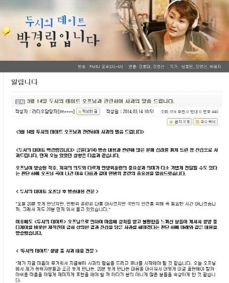그러자 '두시의 데이트 박경림입니다' 제작진도 MBC 홈페이지 프로그램 게시판을 통해 '3월 14일 두시의 데이트 오프닝과 관련해 사과의 말씀 드립니다'라는 제목의 글을 올렸다.