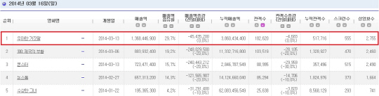 이는 '300 : 제국의 부활' '논스톱' 등 할리우드 영화들을 비롯 이민기, 김고은 주연의 '몬스터' 등 쟁쟁한 경쟁작들을 모두 제치고 박스오피스 1위에 등극한 것.