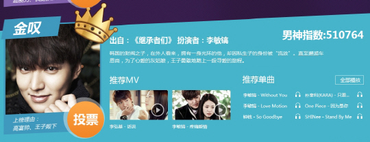 '상속자들'부터 '별에서 온 그대', '미남이시네요', '너의 목소리가 들려' 등 중국에서 사랑받은 드라마와 캐릭터를 대상으로 진행된 이번 투표에는 총 135만5150명이 참여했고 이민호는 '상속자들-김탄'으로 51만764표(37%)를 얻으며 한국 드라마 남신 1위를 차지했다.