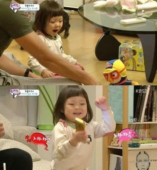 이날 김동현은 추사랑에게 줄 선물로 어린이들의 '대통령' 뽀로로 유모차 인형을 사와 낯가림이 심한 추사랑의 관심을 끌었다. 이어 김동현이 노래하는 뽀로로 인형을 보여주자 추사랑은 한국말로 또박또박 '주세요'를 연발해 김동현을 미소 짓게 만들었다.