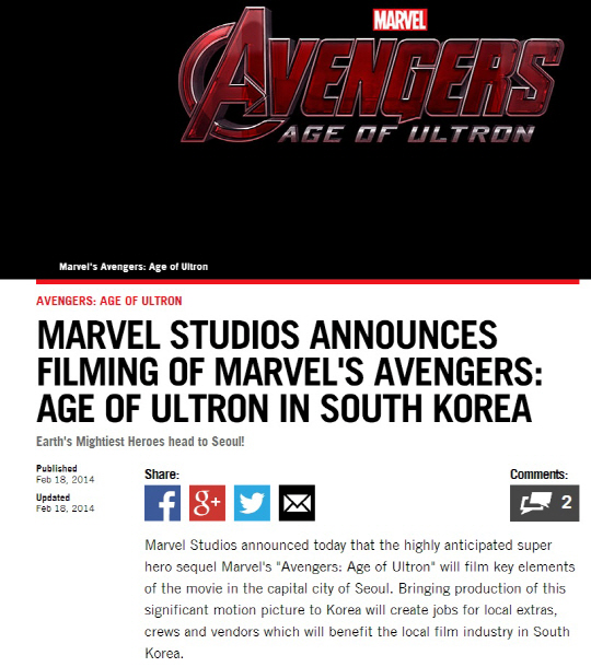 그는 또 "조스 웨던 감독 역시 지난해 11월 로케이션 헌팅차 한국에 방문해 너무즐거웠다고 밝혔다. 웨던은 한국은 '어벤져스2'촬영의 최적 장소라고 언급했다. '아름답고 매력적인 한국에서 촬영해서 이전까지 공개되지않은 한국의 아름다움을 전세계에 공개할 수 있게돼 기쁘다. 최첨단 기술과 독특한 아름다움을 가진 최적의 촬영지다. 멋진 영화 나올 것 같다'고 전했다"고 밝혔다.