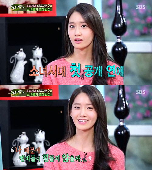 또한 윤아는 "이틀 후 수영 열애 기사가 났을 때 기사가 나지 않았으면 좋았겠다는 생각이 들었다. 공개 연애가 나 혼자였다면 '윤아가 연애한다더라' 하면 되는데 한 명 더 나오면 '소녀시대가 그런다더라'는 말이 나올까 봐 마음이 그랬다"며 공개 연애 후 복잡했던 심정을 드러냈다.