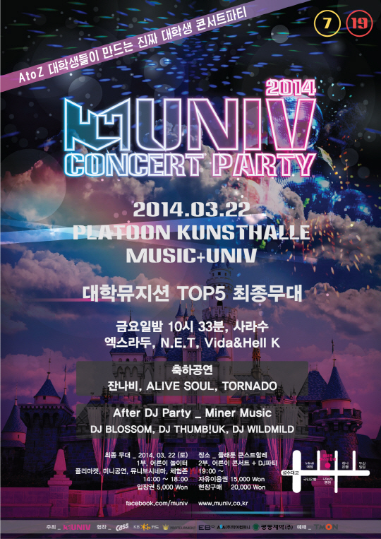 대학 축제는 유명 연예인의 공연장이 되어버린지 오래다. 또 대학생들은 스펙을 쌓느라 다양한 문화생활을 즐기지 못하고 있다. 이런 가운데 대학생들이 직접 만들고 즐기는 독특한 축제가 열려 관심을 모으고 있다. 오는 22일 서울 논현동 플래툰 쿤스트할레에서 열리는 '제 1회 뮤니브 콘서트 파티 2014'가 바로 그것이다.