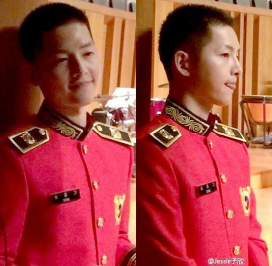 사진 속 송중기는 빨간색 제복을 갖춰 입고 군 장병들의 무대를 바라보고 있다. 특히 송중기는 바짝 깎은 헤어스타일에도 굴욕 없는 외모와 카리스마로 '최강 비주얼' 자랑했다.