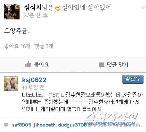 이에 대표팀 공상정도 자신의 인스타그램에 '나도 나도. 나 김수현 짱 오래 좋아했는데. 차강진 아역 때부터 좋아했는데. 김수현 오빠 넌 왜 이렇게 대세인거니. 왜 하필 이 때 SBS 드라마 '별에서 온 그대'를 찍어서'라는 글을 올려 부러움과 질투심 섞인 마음을 전했다.
