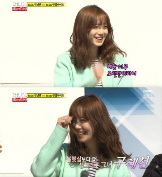 이에 유재석은 '런닝맨'에 처음 출연한 구혜선에게 "'런닝맨'에 온 소감이 어떠냐"고 물었고, 구혜선은 "예능이 너무 오랜만이다"라고 어색해 하는 모습을 보였다.