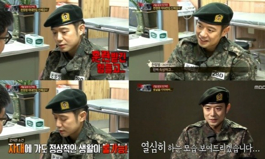 천정명은 "시청자들과의 약속을 지키기 위해 부상에도 불구, 입소했는데 결국 자대배치를 받지 못했다. 늦게 입소 한만큼 더 열심히 하고 싶었는데 그러지 못해 너무 아쉽다"며 "다음 부대에서는 건강한 상태로 더욱 열심히 임할 것이다"이라며 각오를 밝혔다.