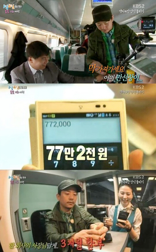 이에 김준호는 4개의 객실에 간식 카트를 밀고 다니며 무료 간식을 제공, 그는 한 시민에게 "살쪄요. 먹지 마요"라며 말하는가 하면 순식간에 카트가 비어버리자 "나는 피라냐인 줄 알았다"고 간식비에 대한 두려움을 나타냈다. 정산을 앞둔 마지막 칸에서는 한 승객에게 "막 가져가라, 이미 만신창이다"고 말하며 보는 이들을 폭소케 했다.