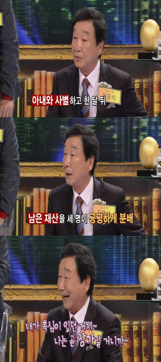 이날 윤문식은 "젊은 사람들이 보통 재산 문제 때문에 부모의 재혼을 반대한다. 그래서 난 전 부인과 사별한 후 한 달 뒤 자식들을 불러놓고 재산 분할을 먼저 했다"고 이야기를 꺼냈다.