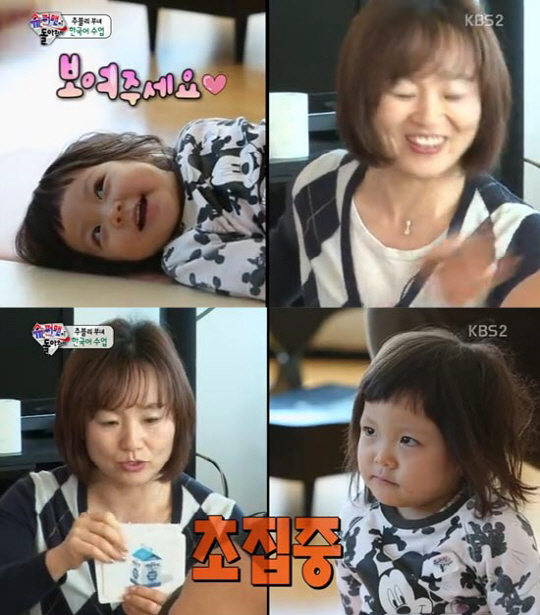 이때 추사랑은 빵, 침대, 전화기, 양말, 아이스크림, 자동차 등 선생님이 보여준 카드에 적힌 이름들을 한번 들은 뒤 바로 맞히는 듯 일취월장한 한국어 실력을 뽐내 추성훈을 흐뭇하게 했다.