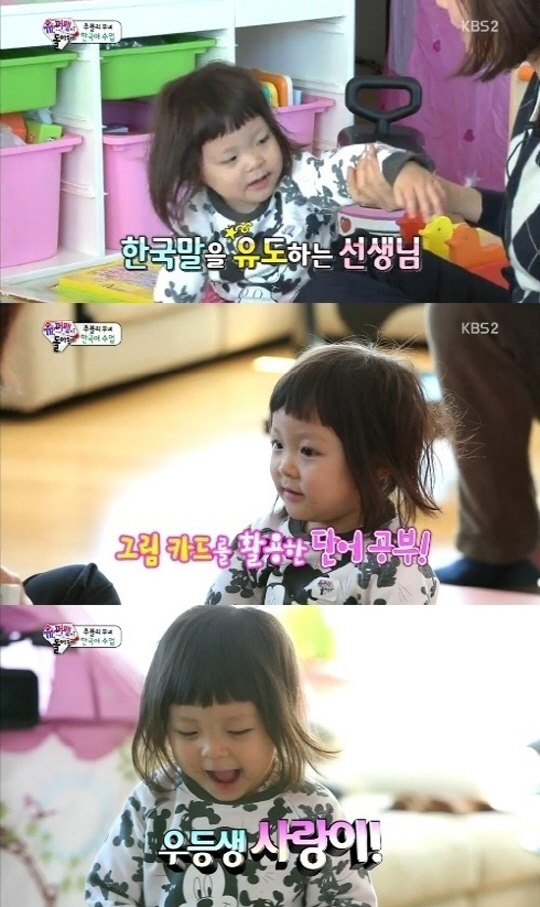 23일 방송된 KBS 2TV 예능프로그램 '해피선데이-슈퍼맨이 돌아왔다'에서 추사랑은 선생님과 함께 한국어 수업에 나섰다. 특히 추사랑의 예전보다 한층 더 성장한 한국어 실력이 눈길을 사로잡았다.