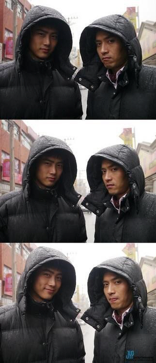 사진 속 박주형과 옥택연은 패딩 점퍼를 입고, 비를 맞으며 무표정한 얼굴로 카메라를 응시하고 있는 모습. 하지만 이내 두 사람은 나란히 천진난만한 미소를 지으며 장난기 가득한 표정으로 '우비형제'같은 느낌을 연출했다.