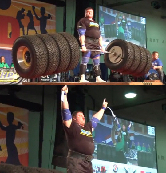 공개된 영상에는 '2014 아놀드 스토롱맨 클래식' 대회에서 리투아니아 출신의 지드루나스 사비카스가 괴력을 발휘하는 모습이 담겨 있다.