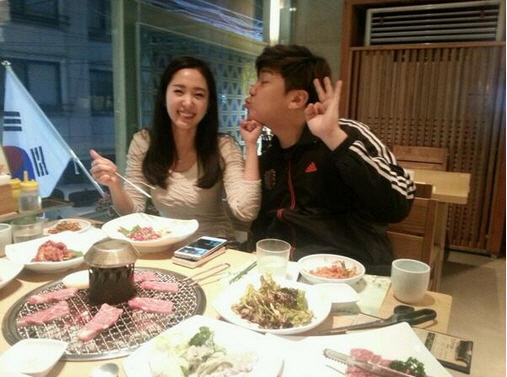 개그맨 최군과 함께 한 식당에서 고기를 먹고 있는 모습이다.