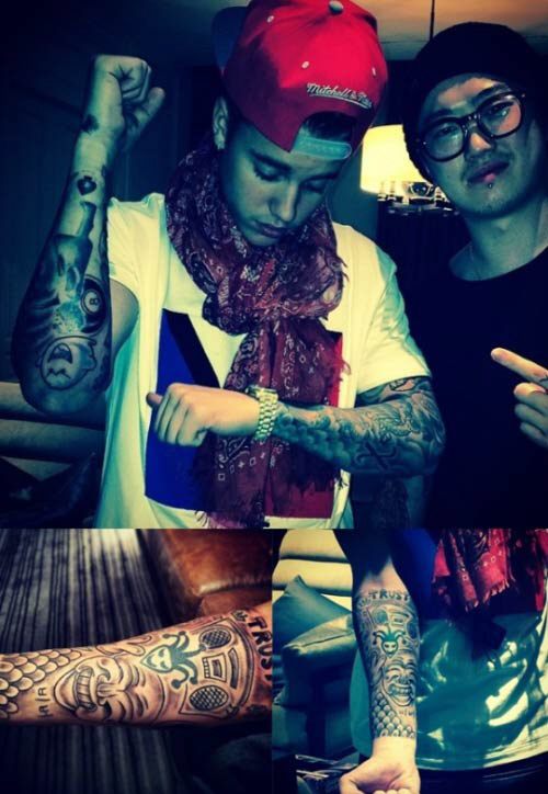 양팔 가득 타투를 새긴 저스틴 비버와 타투아티스트 조승현씨의 모습이 담겨있다.