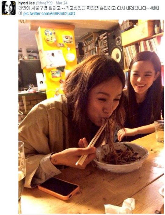 공개된 사진 속에는 한 입 가득 짜장면을 흡입하고 있는 이효리의 모습이 담겨 있다. 이어 먹고 싶었던 짜장면을 입에 물고 행복해 하는 그녀의 털털한 모습이 인상적이다.