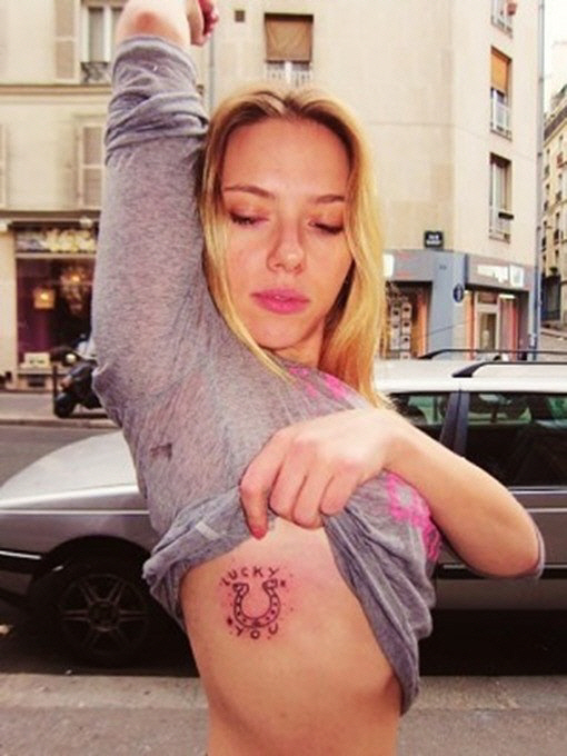 이는 지난 2012년 타투 예술가 푸지 우흐트프크가 자신의 홈페이지를 통해 공개한 사진으로, 사진 속 스칼렛 요한슨은 길거리에서 티셔츠를 겨드랑이 부위까지 들어 올린 채 갈비뼈 라인에 새겨진 말굽 모양의 문신을 공개하고 있다.