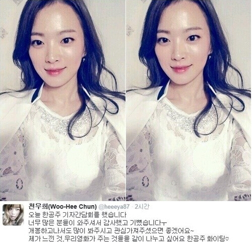 천우희는 "오늘 한공주 기자간담회를 했습니다"며 "너무 많은 분들이 와주셔서 감사했고 기뻤습니다. 개봉 하고 나서도 많이 봐주시고 관심 가져 주셨으면 좋겠어요. 제가 느낀 것, 우리 영화가 주는 것들을 같이 나누고 싶어요. 한공주 파이팅"이라고 썼다.