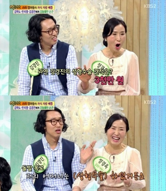 김경진의 어머니는 "경진이가 전교 1등을 한 후 강남의 한 성형외과를 방문했는데 당시 성형수술 견적이 3천만 원이 나왔다"며 "얘가 눈도 단춧구멍만 하고 치아도 튀어나오고, 한 번 손을 대면 전체를 다 해야 한다더라"고 말해 보는 이들의 웃음을 자아냈다.