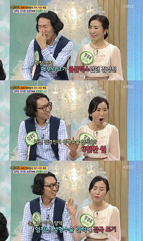 이에 어머니 정 씨는 "강남 성형외과에 갔더니 코만 하면 괜찮은데 눈도 단춧구멍처럼 작고, 입도 튀어나와서 견적이 너무 많이 나왔다. 당시 3천만 원이었다. 손을 대면 전체를 다 해야 한다더라"고 말했다. 이어 "지금 생각해보면 수술 안 시키길 정말 잘했다"고 덧붙였다.