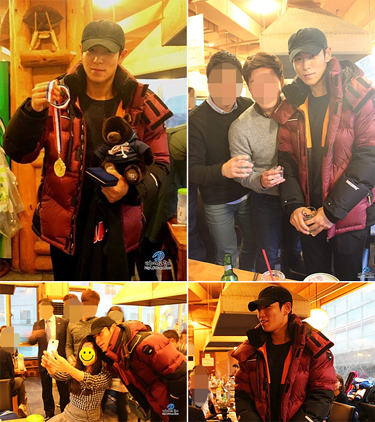 사진에는 학교 회식에 참석한 탑이 학우들과 함께 인증샷을 찍는 모습과 단국대학교 기념품을 들고 포즈를 취하고 있는 모습 등이 담겨 있다. 특히 탑은 패딩점퍼를 입고 모자를 눌러 쓴 수수한 차림에도 조각 같은 외모를 뽐내 시선을 사로잡았다.