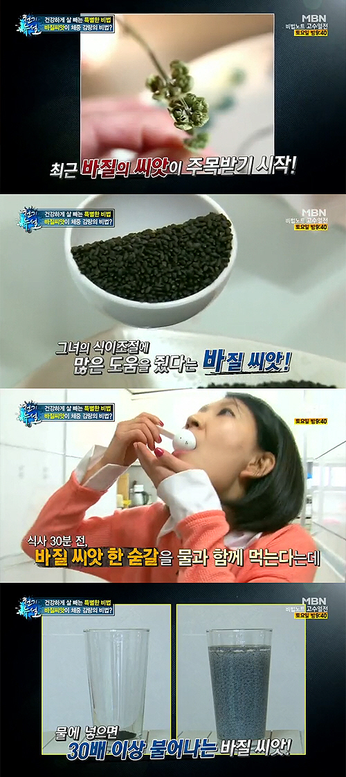 또한 "(바질) 식이섬유소가 물속에 들어가면 아주 끈끈한 물질로 변해서 이게 대장까지 내려가는 데 시간이 오래 걸린다. 우리의 위에서 머무르는 시간이 길기 때문에 배고픔을 잊을 수 있고 또 내려가면서 그냥 내려가는 게 아니라 끈끈한 성질이 뮤코 단백질 성분인데 뮤코 성분들이 우리 위장, 대장, 소장에 붙어있는 나쁜 독소들을 제거해주는 디톡스 효과도 있다"고 밝혔다.