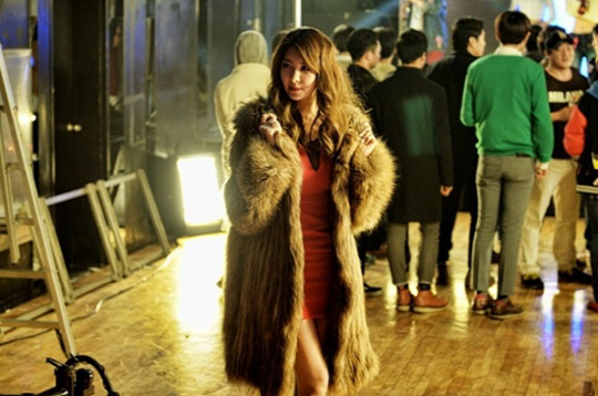이파니는 밀착된 레드원피스에 퍼를 매치해 섹시한 매력을 발산하고 있다.