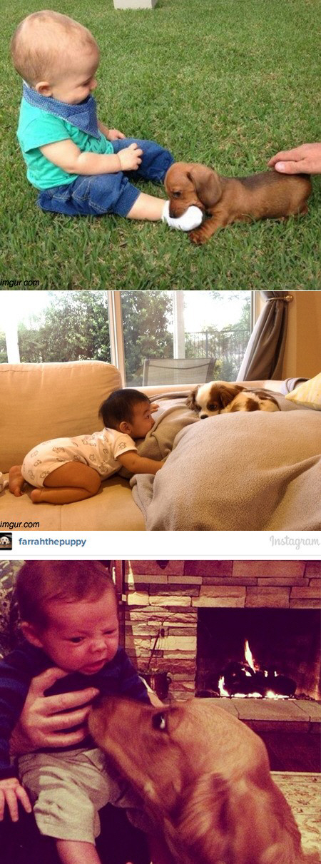 사진에는 태어나 처음으로 개를 본 아기들의 다양한 반응이 담겨 있다. 자신보다 훨씬 작은 강아지를 보고 함박웃음을 짓는가 하면 똑같은 포즈로 엎드려 물끄러미 바라보기도 한다.