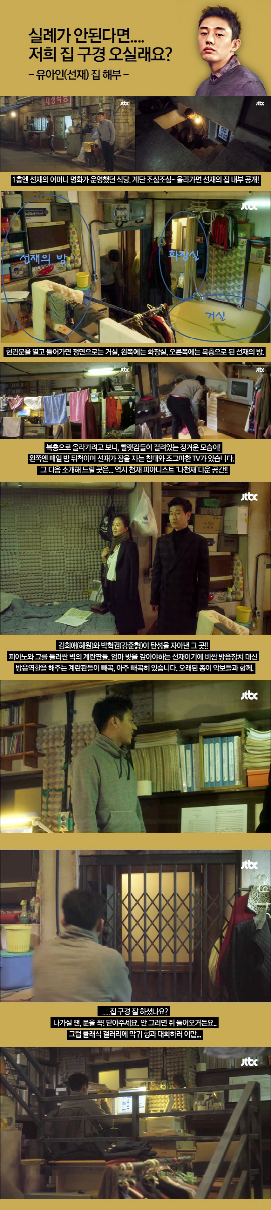 '밀회' 공식 홈페이지에 올라온 사진 속에는 무심코 넘겼던 선재(유아인 분)의 집을 꼼꼼하고 상세하게 분석하여 눈길을 끌고 있다. 선재의 집은 어머니(이칸희)가 운영하시는 식당 위 초라하지만 따뜻한 느낌을 주는 옥탑방으로 리얼한 소품과 가재도구로 드라마의 사실성을 더했다.
