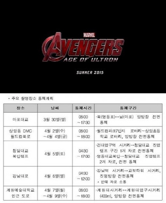 '어벤져스2'는 오늘 시작된 첫 촬영 이후 오는 4월 14일까지 상암동 DMC, 월드컵북로, 청담대교, 강남대로, 계원예술대학교, 문래동 철강거리 등에서 촬영을 진행한다.