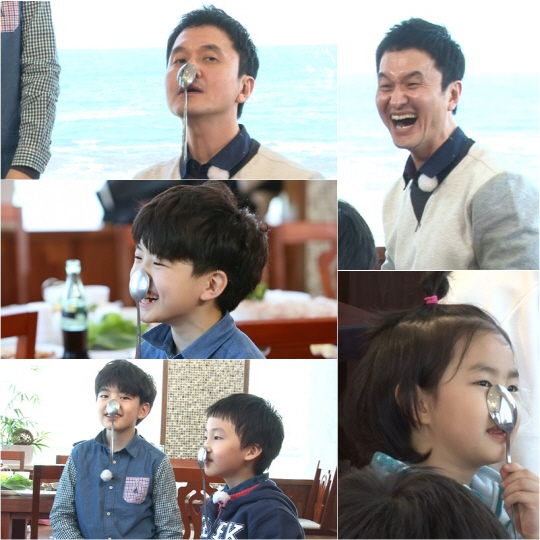 제주도에 도착해 다 함께 식사를 마치고 오랜만의 한가로움을 느끼던 장현성 가족. 슬슬 장난기가 발동한 장현성은 "내가 새로운 묘기를 보여줄 테니 잘 봐"라며 아이들 앞에서 코에 숟가락 붙이기를 시도했다. 무슨 일인가 싶어 눈을 반짝이던 아이들은 순간 "와우" 하며 탄성을 내질렀다. 숟가락이 장현성의 코에 찰싹 달라 붙어 있는 것. 이에 쌍둥이 아빠 이휘재부터 타블로의 딸 하루까지 너나 할 것 없이 숟가락 묘기에 도전했고, 장현성의 두 아들 준우와 준서가 멋지게 성공시키며 박수갈채를 받았다. 환한 웃음으로 묘기를 선보이는 형제를 바라보던 장현성은 "과연 내 아들들이다" 라고 기뻐해 식당을 웃음 바다로 만들었다.