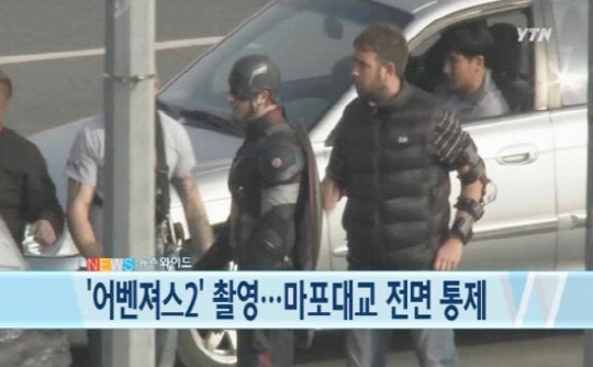 YTN 보도에 따르면 이날 오전 8시30분쯤 '캡틴아메리카'로 분장한 배우가 마포대교 남단 쪽에 모습을 드러냈다. 현장에서 포착된 배우가 크리스 에반스인지 그의 대역인지는 아직 알려지지 않았다.