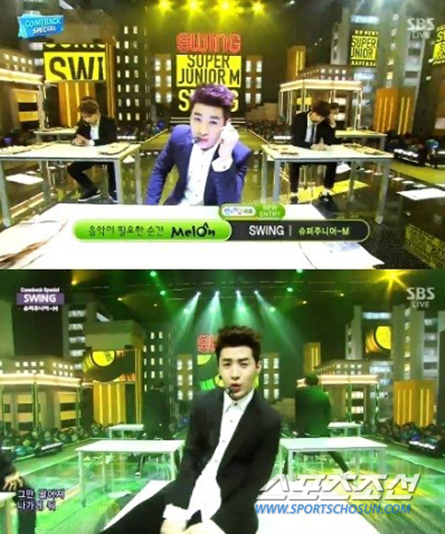 슈퍼주니어M은 30일 방송된 SBS '인기가요'에서 타이틀곡 'SWING'(스윙)의 박력 있는 무대를 선보였다. 이날 슈퍼주니어M은 전원 수트 차림으로 등장, 서류를 날려버리며 박차고 일어난 뒤 외투를 벗고 파워풀하게 댄스를 추는 퍼포먼스를 선보였다.
