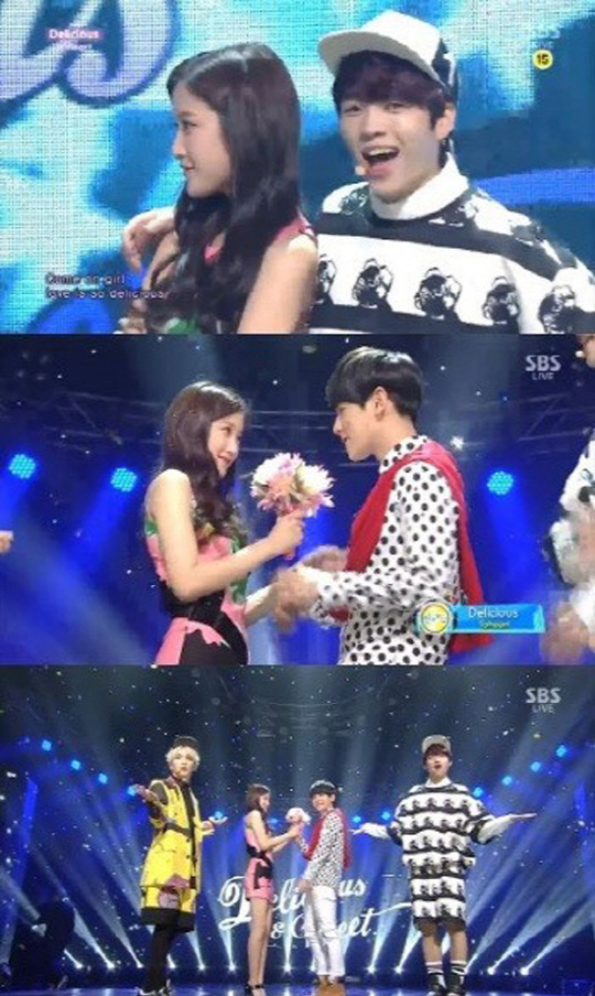 30일 방송된 SBS '인기가요'에서 투하트(남우현, 키)의 '딜리셔스' 무대에 배우 문가영과 백현이 등장, 두 사람은 연인 연기를 펼치며 눈길을 끌었다.