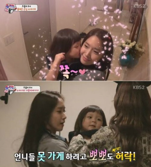 추사랑은 공연 시간으로 인해 떠나려는 소녀시대 멤버들을 막기 위해 문을 잠그며 아쉬운 마음을 드러냈다. 특히 윤아의 품에 안겨 다정한 '볼뽀뽀'를 해 시선을 모았다.