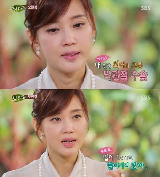 이날 오현경은 "악관절이 심해 수술을 3번이나 받았다"며 "인생에서 가장 고통스러운 시기를 보냈다"고 말했다.